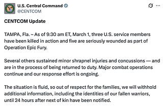 Three U.S. service members KIA, five "seriously wounded." Additional number of U.S. military wounded with shrapnel and concussion injuries. Separately…