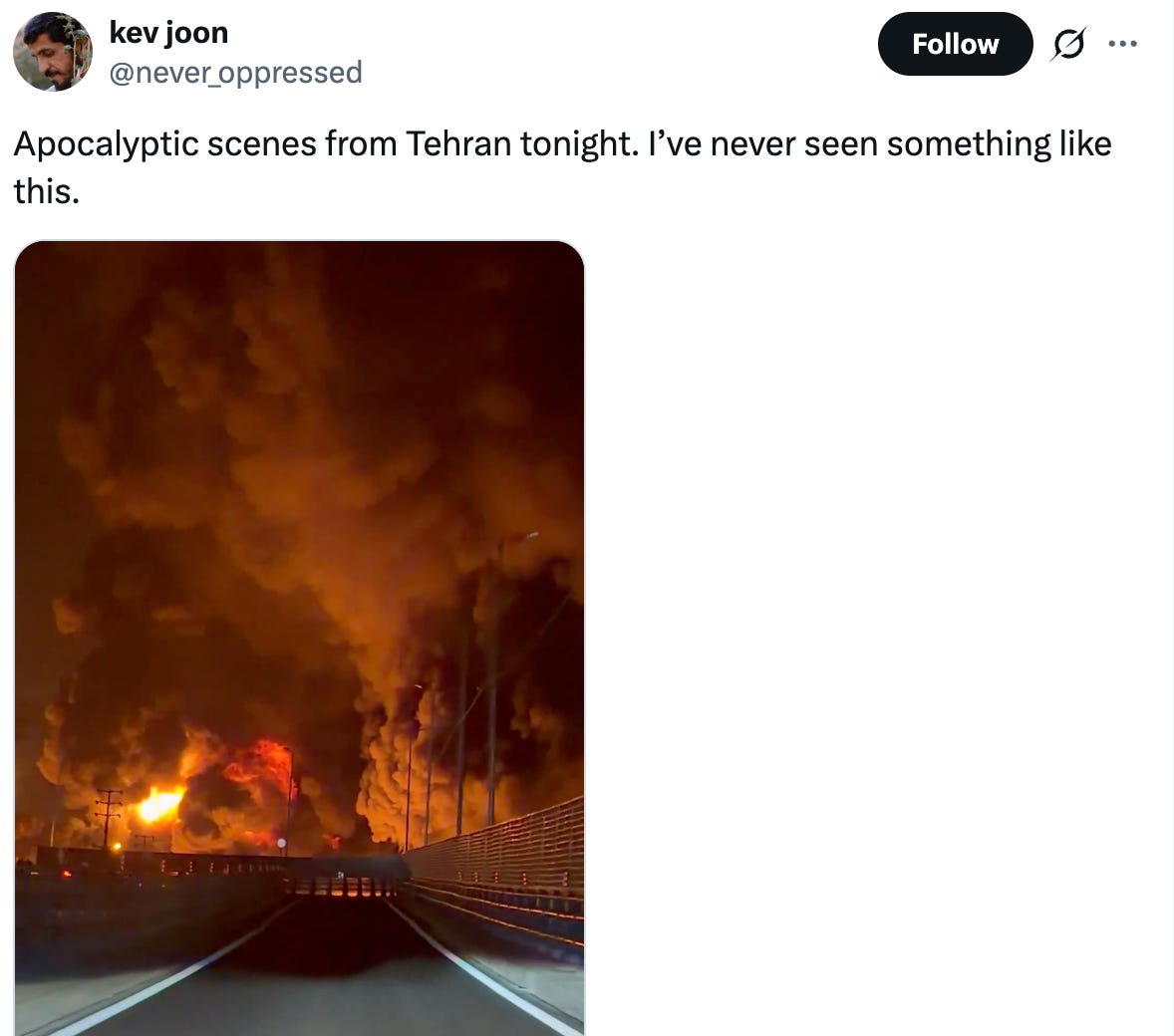 ATTACK ON OIL DEPOT LEAVES TEHRAN BURNING: Late Saturday, huge flames and columns of smoke spread across Tehran as the capital city was set ablaze after Israel hit Iranian oil infrastructure for the first time since the start of the war. Multiple oil depots in Tehran and Alborz have been attacked, according to Iran’s Oil Minister. Israel claimed responsibility for the strike and said that it hit fuel storage and energy complexes.