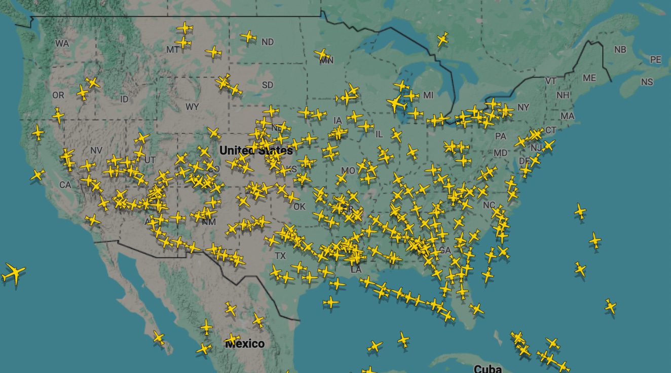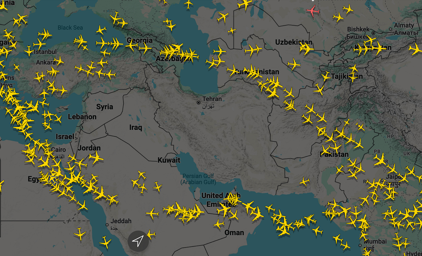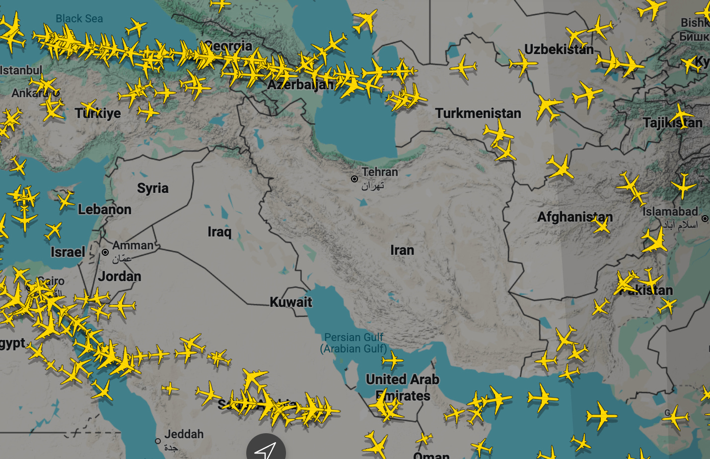 Nowadays, those little yellow plane icons over the Middle East look like ants chasing a common breadcrumb — all in a line, pointing the same direction. The map looks less like the scattered chaos you see over North America and more like a handful of lines squeezed between large empty spaces.