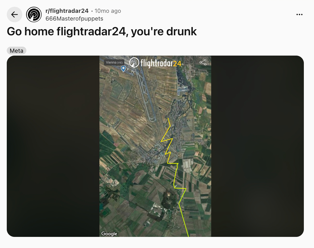 That wider audience has also turned strange flightpaths into a viral joke online. A popular meme shows a chaotic, zigzagging flight path with the caption, “Go home Flightradar24, you’re drunk.” But those strange lines are often the result of GPS spoofing, and it might be less funny than the meme implies.