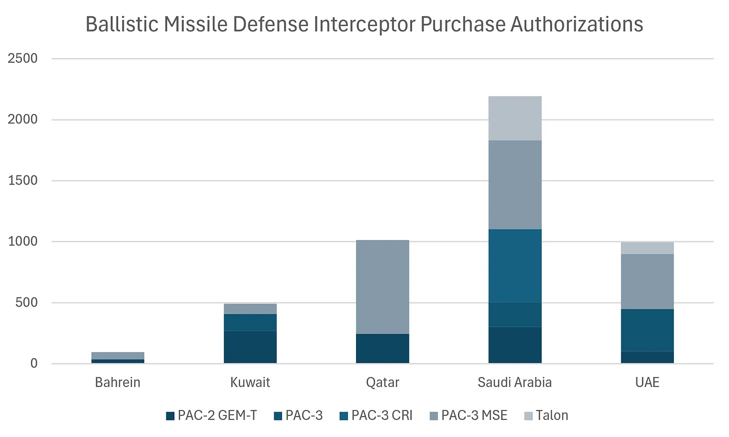 The table above provides an estimate of ballistic missile interceptor stocks that the Gulf states were authorized to purchase before the war. Note that this estimate represents a theoretical maximum — often they will purchase less, possibly around 50 to 80 percent.