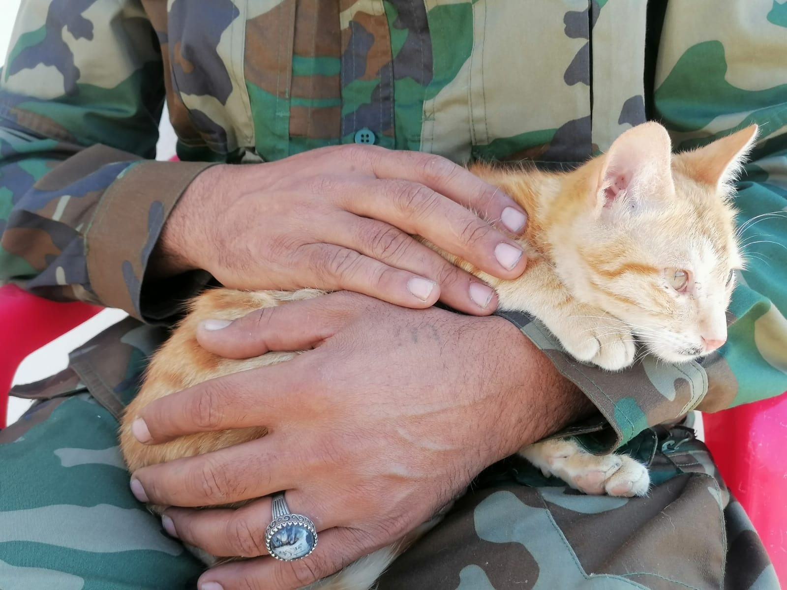 Despite the aerial threat to Topzawa camp, less than 20 miles northwest of Erbil, it had a welcoming energy. Afsaneh sat comfortably in a red plastic chair sipping tea as orange tabby cats lolled around, at ease in the shadow of war. She picked one up and cuddled it until it squirmed to be put down. She loves her cats. One had been injured in the strike, she said. It was nothing serious, just a paw wound, but enough that it needed treatment.