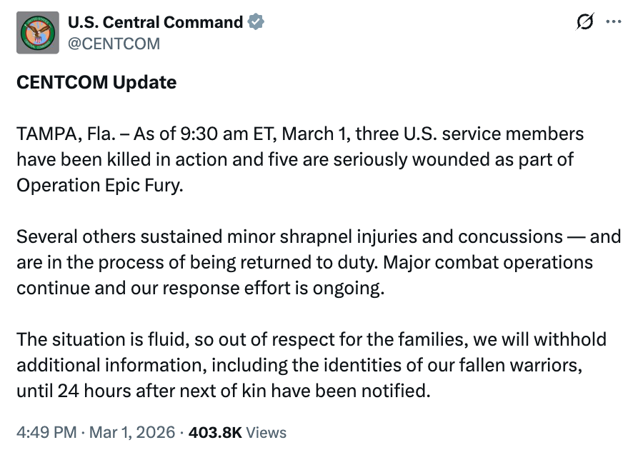 U.S. Central Command, which oversees U.S. military operations in the Middle East, announced that three U.S. service members have been killed in action, and another five “seriously wounded"