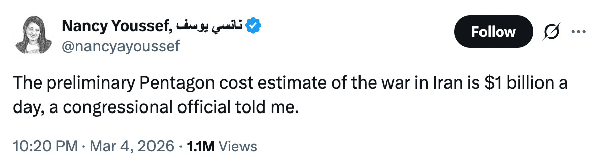 IRAN WAR COST – BILLIONS PER DAY: Per The Atlantic’s Nancy Youssef: