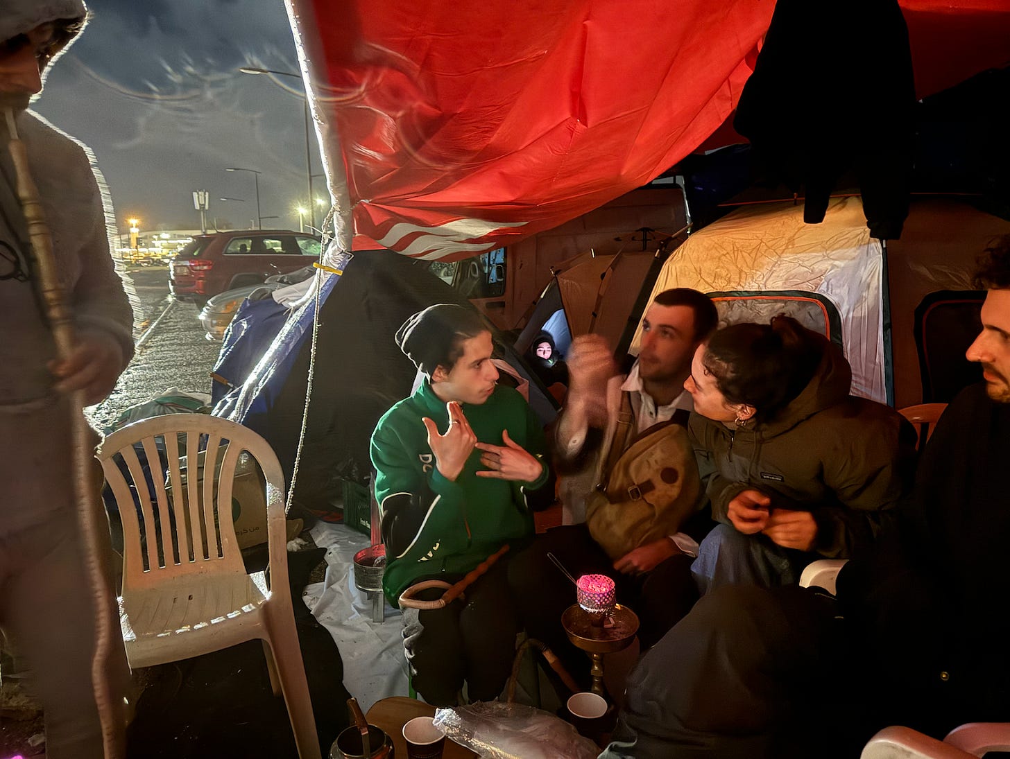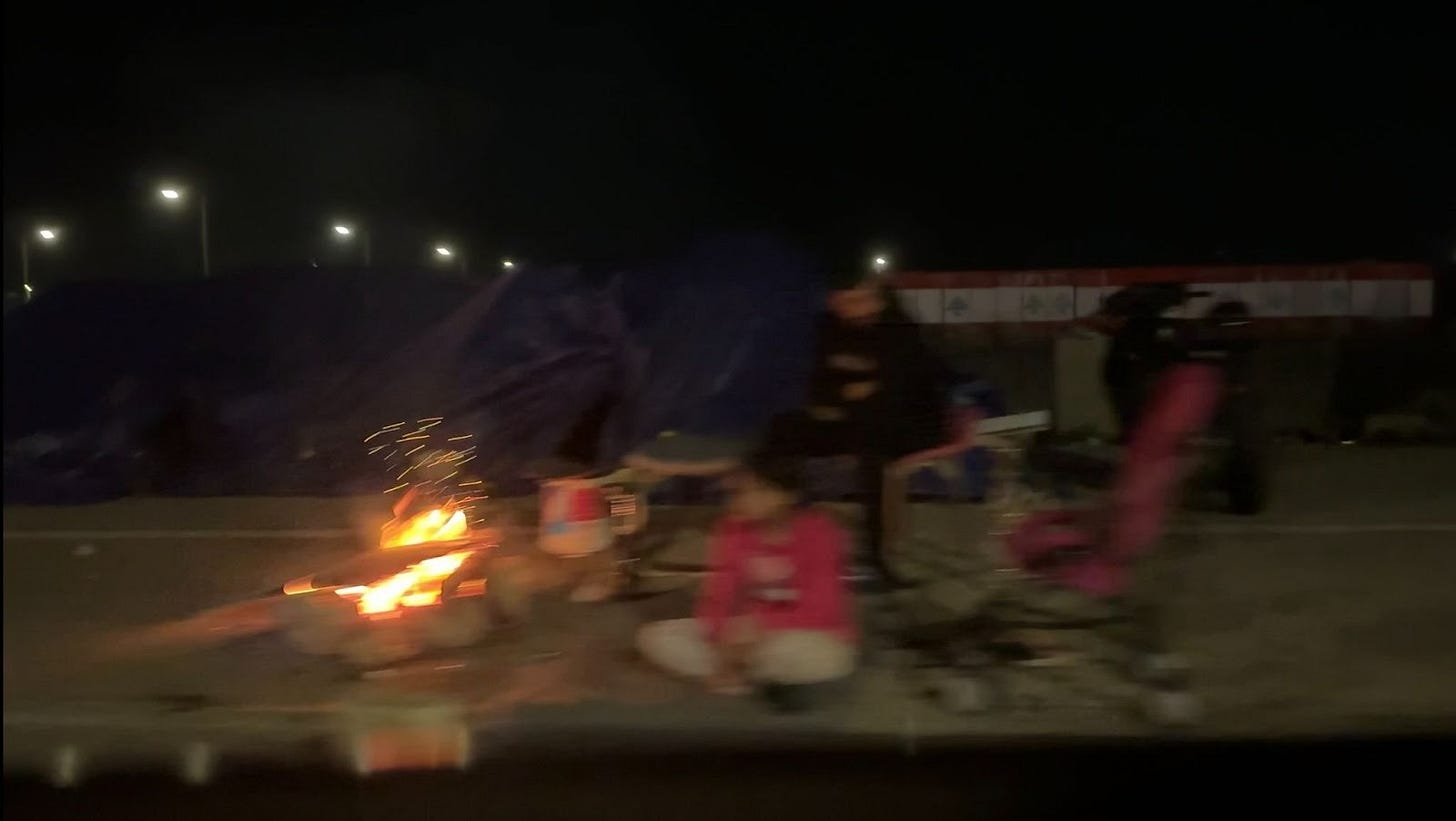 By the time they passed Elias’s house, he was halfway across the country, sitting beneath a polyurethane cover on Beirut’s waterfront. Most of his family now lives under the rectangular structure, next to ever-expanding rows of tents dotted with small fires.