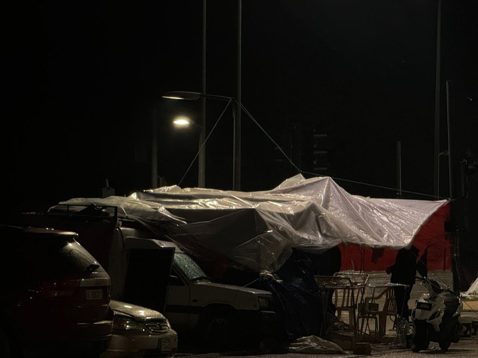 The real brilliance, Elias explained, was the other side of the streetlight, where the pair recently finished a covered room tall enough to stand in, filling out tarp walls with wooden pallets wrapped in cellophane.
